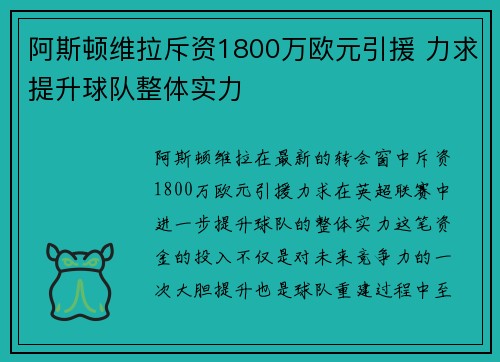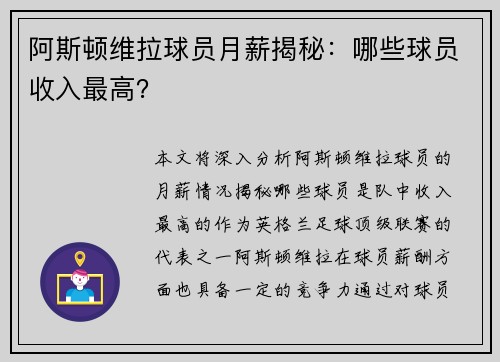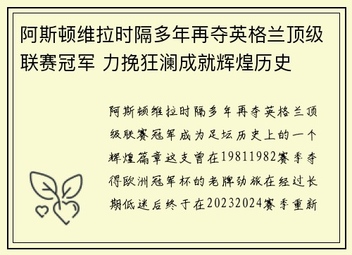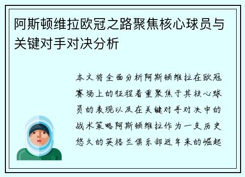 本文将对阿斯顿维拉的实力进行深入分析,探讨其在英超中的竞争力。阿斯顿维拉,这支具有悠久历史的俱乐部,近年来在英超中逐渐崭露头角。本文将从四个方面展开分析:球队阵容的实力与深度、主教练的战术安排与领导力、球队的攻防表现以及与其他英超强队的竞争对比。每个方面都会详细探讨其优势和不足,结合当前的联赛形势,...